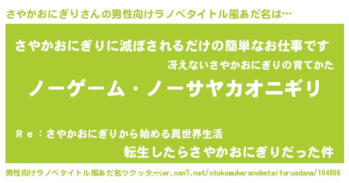 | 伝説のあだ名 | 『救世主となる錬金術士さやかおにぎり』 |