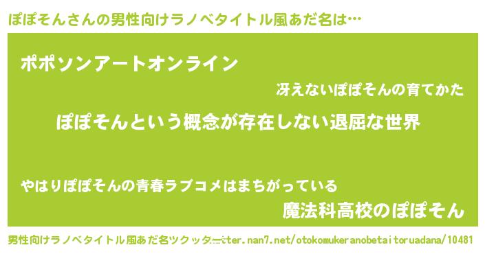 | 女子向けラノベタイトル風あだ名 | 『異世界で失敗しない100のぽぽそん』 |