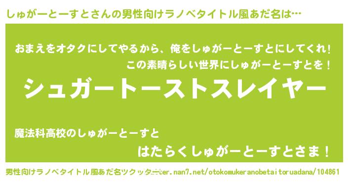 | 胡散臭い通販商品みたいなあだ名 | 『100人中100人が認めたイリジウム磁石…その名も「しゅがーとーすと」』 |