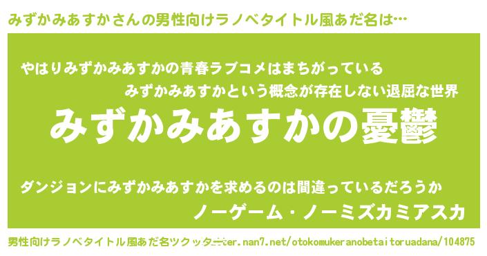 | 女子向けラノベタイトル風あだ名 | 『(仮)みずかみあすかのやんごとなき事情』 |