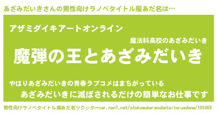 | 女子向けラノベタイトル風あだ名 | 『あざみだいきが死なない童話 林檎のあざみだいきの診療簿』 |