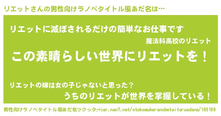 | 女子向けラノベタイトル風あだ名 | 『悪役リエットに転生したようですが、知った事ではありません』 |