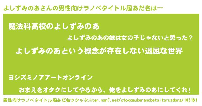| 胡散臭い通販商品みたいなあだ名 | 『絶対に幸福をもたらす水素水…その名も「よしずみのあ」』 |