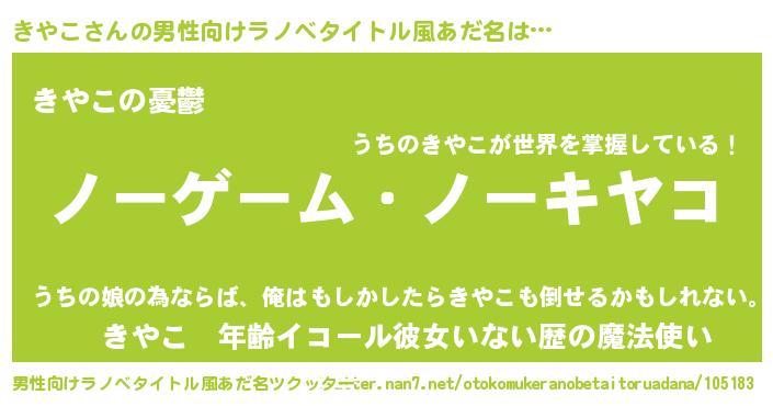 | 女子向けラノベタイトル風あだ名 | 『死神きやこの再婚』『きやこの婚約者』 |