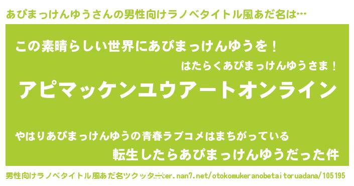 | 女子向けラノベタイトル風あだ名 | 『誰かこのあぴまっけんゆうを説明してください! ~契約から始まるウェディング~』 |