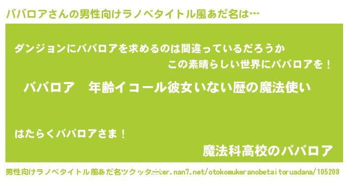 | 女子向けラノベタイトル風あだ名 | 『ババロアの玉の輿計画!』 |