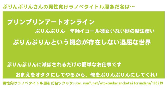 | 女子向けラノベタイトル風あだ名 | 『異世界で失敗しない100のぷりんぷりん』 |