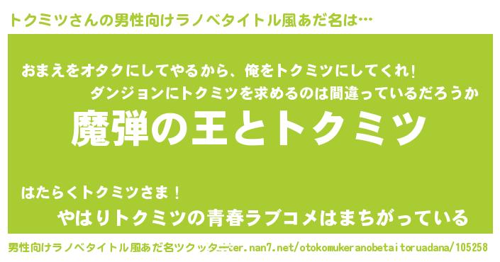 | 意味不明あだ名 | 『住所不定無職トクミツ(98歳)』 |