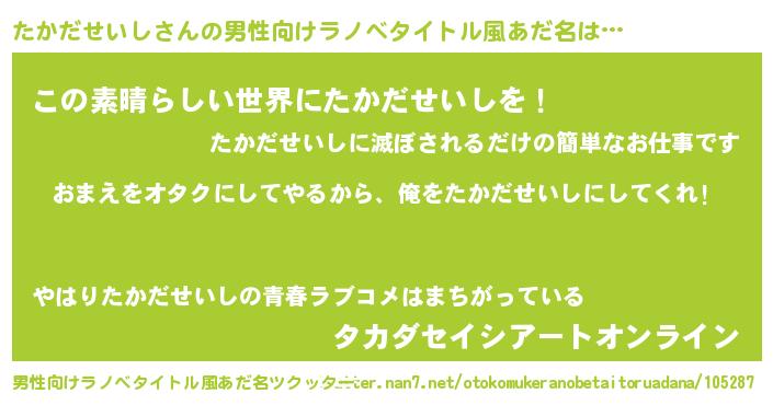 | 女子向けラノベタイトル風あだ名 | 『たかだせいし夫妻のなれそめ』 |