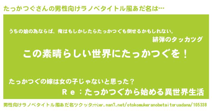 | 胡散臭い通販商品みたいなあだ名 | 『あなたにだけ特別に提供する100年もののヴィンテージワイン…その名も「たっかつぐ」』 |