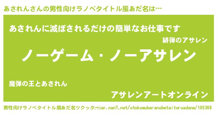 | 女子向けラノベタイトル風あだ名 | 『死神あされんの再婚』 |