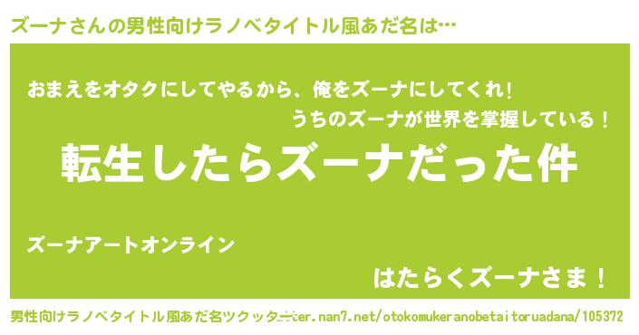 | 女子向けラノベタイトル風あだ名 | 『ズーナの玉の輿計画!』『ズーナ恋絵巻』 |