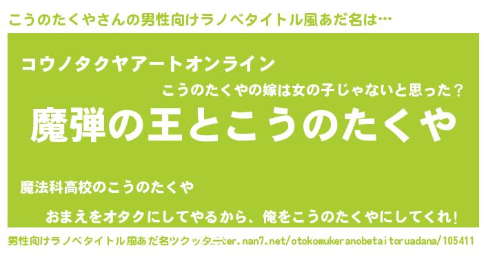 | 女子向けラノベタイトル風あだ名 | 『こうのたくやが死なない童話 林檎のこうのたくやの診療簿』 |