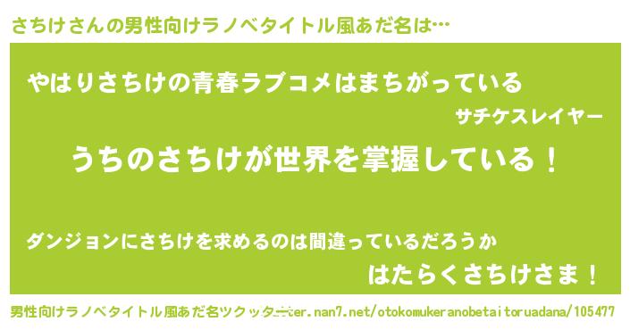 | 胡散臭い通販商品みたいなあだ名 | 『運命の人と巡り会える高級そうな皿…その名も「さちけ」』 |