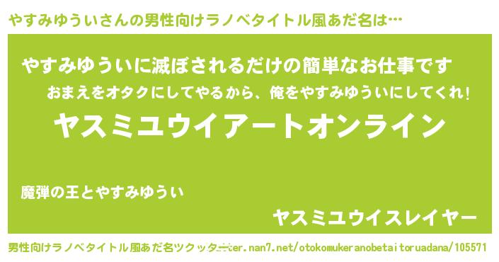 | 女子向けラノベタイトル風あだ名 | 『誰かこのやすみゆういを説明してください! ~契約から始まるウェディング~』 |