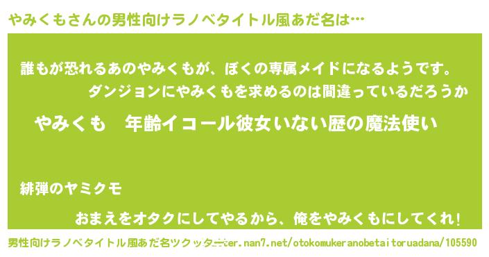 | 女子向けラノベタイトル風あだ名 | 『やみくもの玉の輿計画!』 |