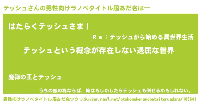 | 女子向けラノベタイトル風あだ名 | 『異世界で失敗しない100のテッシュ』 |