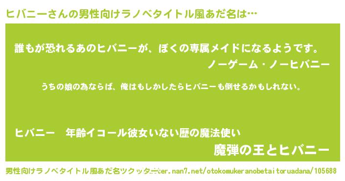 | 女子向けラノベタイトル風あだ名 | 『ヒバニーの婚約者』『ヒバニー恋絵巻』 |
