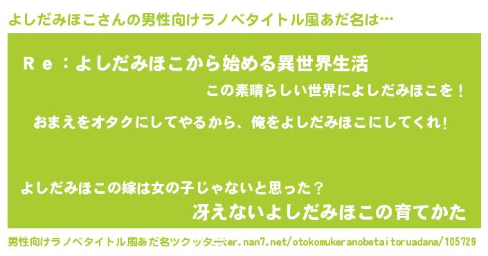 | 女子向けラノベタイトル風あだ名 | 『よしだみほこ夫妻のなれそめ』 |