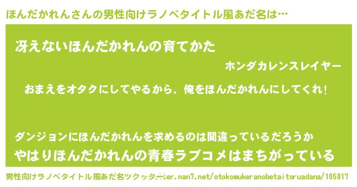 | 女子向けラノベタイトル風あだ名 | 『ほんだかれん夫妻のなれそめ』 |