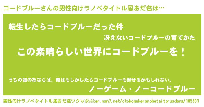| 胡散臭い通販商品みたいなあだ名 | 『あなたにだけ特別に提供する世界で10本だけ現存している希少なブランデー…その名も「コードブルー」』 |