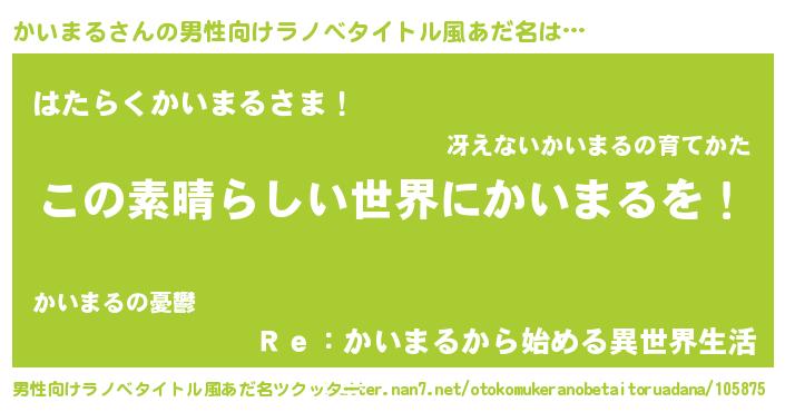 | 女子向けラノベタイトル風あだ名 | 『悪役かいまるに転生したようですが、知った事ではありません』 |