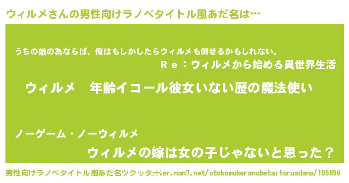 | 女子向けラノベタイトル風あだ名 | 『ウィルメの玉の輿計画!』 |