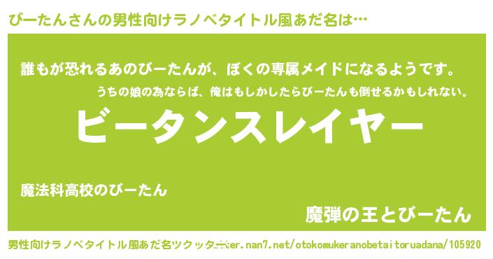 | 胡散臭い通販商品みたいなあだ名 | 『絶対に幸福をもたらす健康食品…その名も「びーたん」』 |