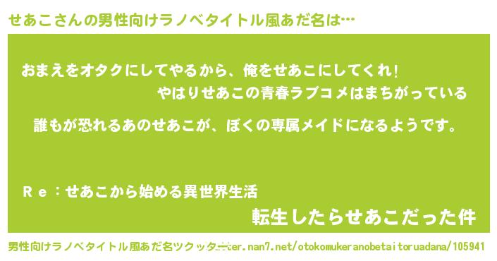 | ヘコむあだ名 | 『せあこ(笑)』『なまこ酢』『せあお』 |