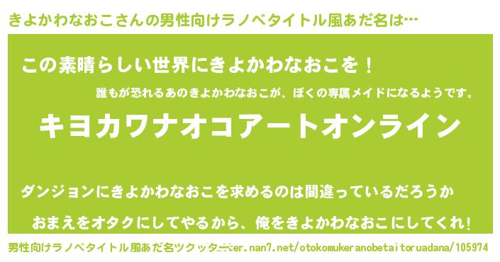 | 女子向けラノベタイトル風あだ名 | 『誰かこのきよかわなおこを説明してください! ~契約から始まるウェディング~』 |