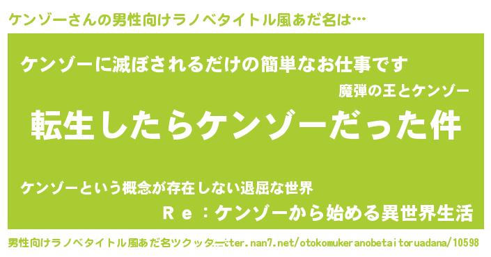 | 女子向けラノベタイトル風あだ名 | 『ケンゾーの玉の輿計画!』 |