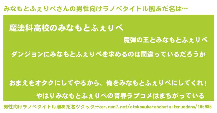 | 女子向けラノベタイトル風あだ名 | 『みなもとふぇりぺの卵を拾いまして』 |