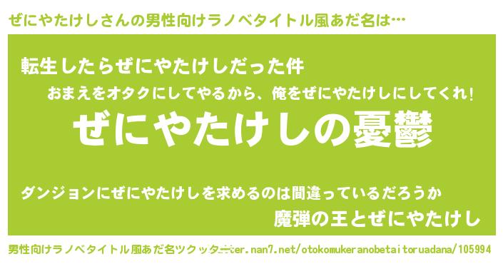 | 女子向けラノベタイトル風あだ名 | 『(仮)ぜにやたけしのやんごとなき事情』 |