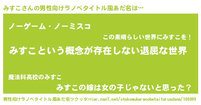 | 胡散臭い通販商品みたいなあだ名 | 『来世でも幸せになれる水素水…その名も「みすこ」』 |