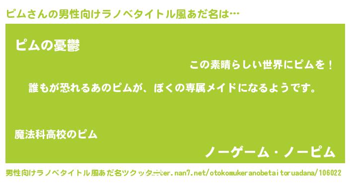 | 女子向けラノベタイトル風あだ名 | 『ピムの契約王妃』『死神ピムの再婚』 |