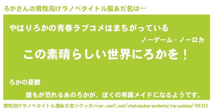 | 女子向けラノベタイトル風あだ名 | 『悪役ろかに転生したようですが、知った事ではありません』 |