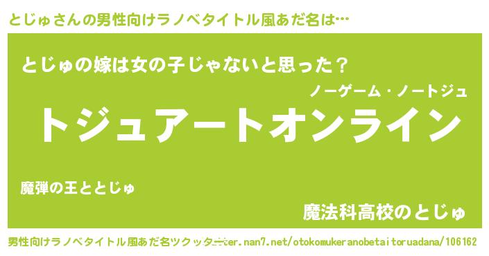 | 女子向けラノベタイトル風あだ名 | 『誰かこのとじゅを説明してください! ~契約から始まるウェディング~』 |