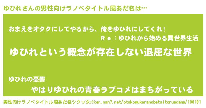 | 女子向けラノベタイトル風あだ名 | 『異世界で失敗しない100のゆひれ』 |
