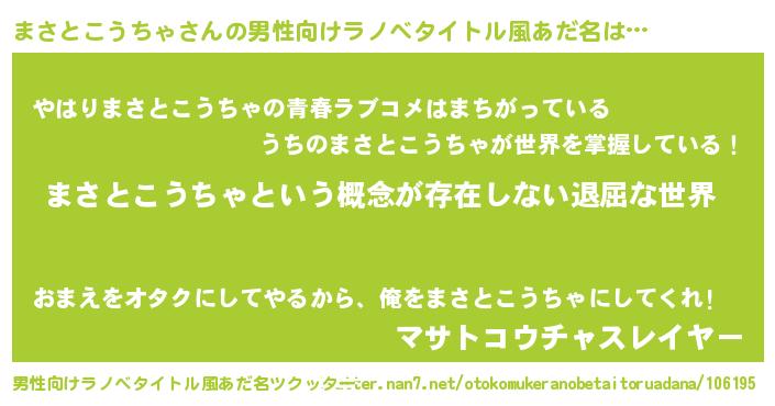 | 女子向けラノベタイトル風あだ名 | 『異世界で失敗しない100のまさとこうちゃ』 |