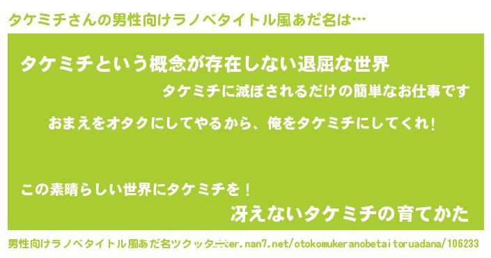 | 女子向けラノベタイトル風あだ名 | 『タケミチ夫妻のなれそめ』 |