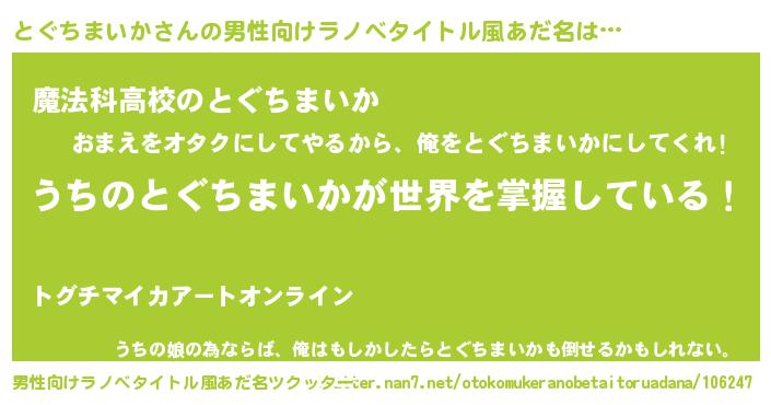 | 女子向けラノベタイトル風あだ名 | 『男装とぐちまいかの憂鬱な任務』 |