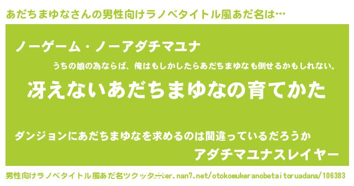 | 肩書あだ名 | 『あだちまゆな船長』『あだちまゆな大将』 |