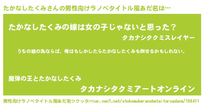| 女子向けラノベタイトル風あだ名 | 『たかなしたくみ伯爵の花嫁』 |