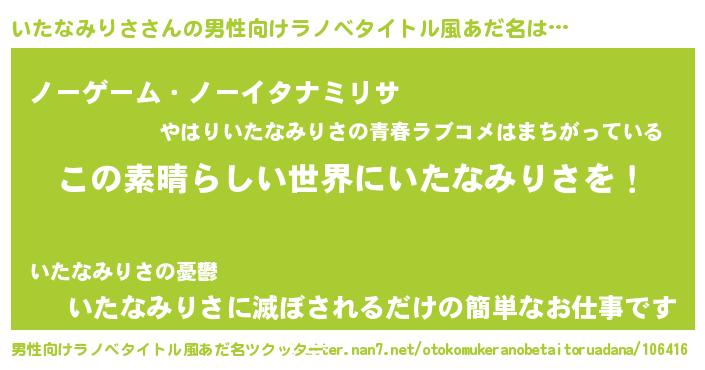 | 女子向けラノベタイトル風あだ名 | 『悪役いたなみりさに転生したようですが、知った事ではありません』 |