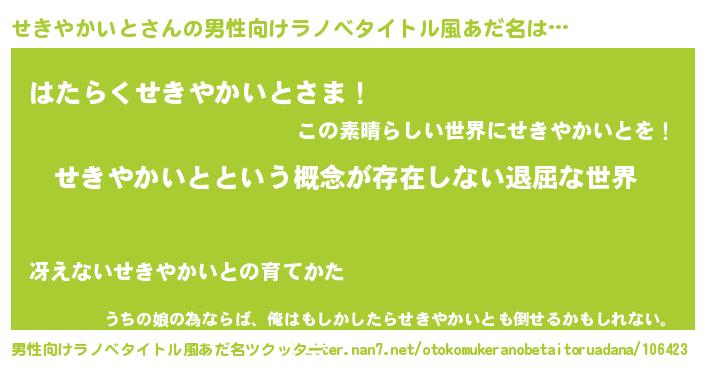 | 女子向けラノベタイトル風あだ名 | 『異世界で失敗しない100のせきやかいと』 |