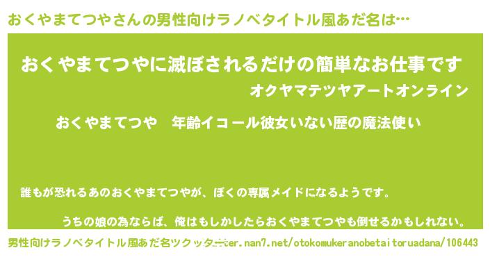 | 女子向けラノベタイトル風あだ名 | 『おくやまてつやの玉の輿計画!』 |