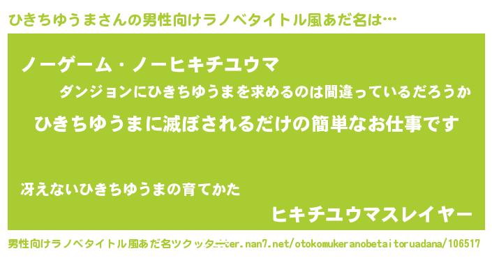 | ヒーロー風カッコイイあだ名 | 『愛の使者ひきちゆうま』『暗黒騎士ヒキ』 |
