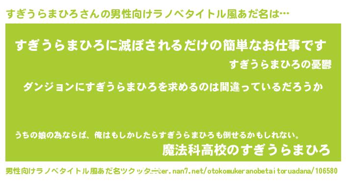 | 胡散臭い通販商品みたいなあだ名 | 『信頼と実績のサプリメント…その名も「すぎうらまひろ」』 |