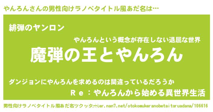 | 女子向けラノベタイトル風あだ名 | 『乙女ゲームの破滅フラグしかない悪役やんろんに転生してしまった…』 |
