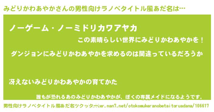 | 女子向けラノベタイトル風あだ名 | 『みどりかわあやかの卵を拾いまして』 |